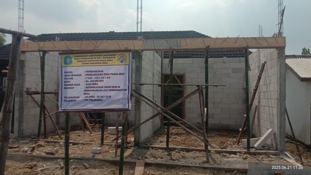 Lamongan. Tujuan pembangunan Toko pasar Desa, tentunya akan memberikan ruang bagi para pelaku UMKM lokal, selain itu, juga sebagai tempat sarana dalam menggali potensi yang ada di desa . Seperti di Desa Purwokerto Kecamatan Ngimbang, kini telah membangun Dua unit toko pasar dari anggaran DD tahun 2025.