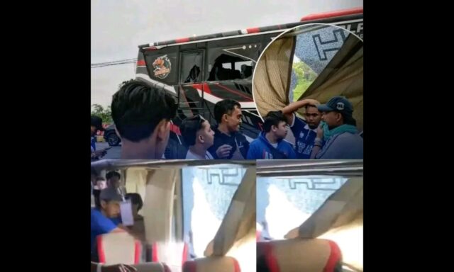 Koran Pilar. Mojokerto – Jawa Timur. Sebuah unggahan video di media sosial mendadak viral yang memperlihatkan aksi pelemparan batu terhadap bus rombongan Aremania oleh oknum tidak dikenal. Insiden ini dilaporkan terjadi di ruas jalan tol area Mojokerto pada Senin (9/2), saat rombongan suporter dalam perjalanan pulang menuju Malang.