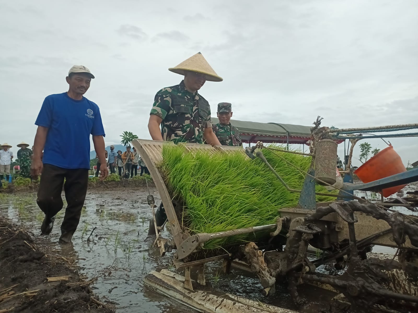 Komandan Kodim 0807/Tulungagung, Letkol Kav. M. Nashir saat melakukan penanaman benih padi menggunakan transplanter