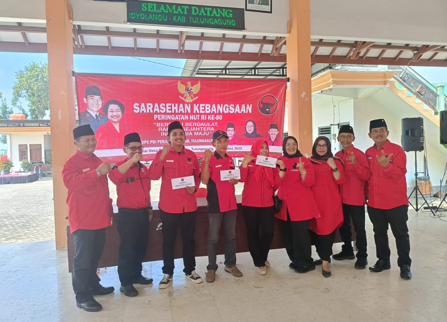 Tulungagung. – Plt. Ketua DPC PDIP Tulungagung, Erma Susanti, bersama seluruh jajaran kader menggelar upacara pengibaran Sang Saka Merah Putih dalam rangka memperingati HUT ke-80 Kemerdekaan RI, Minggu (17/8/2025), di Desa Bono, Kecamatan Boyolangu.