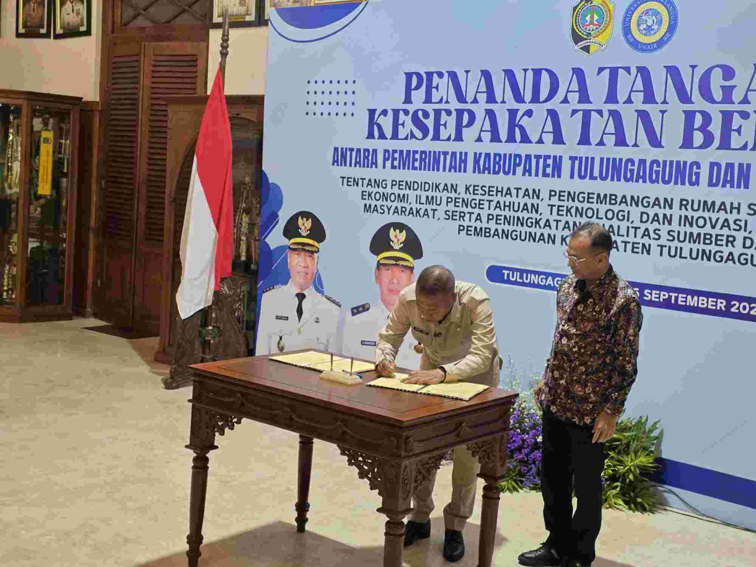 Tulungagung – Pemerintah Kabupaten Tulungagung resmi menandatangani nota kesepahaman (MoU) dengan Universitas Airlangga (UNAIR) Surabaya dalam sebuah seremoni megah di Pringgitan Pendopo Kongas Arum Kusumaning Bongso, pada Selasa (16/09/2025).